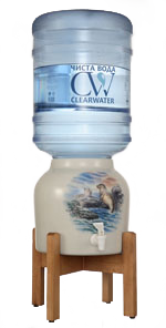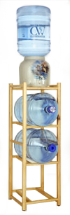 Прежде, чем начать рассказ о способах розлива воды, следует напомнить важное правило. Бутыль с водой нельзя оставлять на солнце! Солнце и вода - это именно та среда, в которой с удовольствием размножаются микроскопические растения - зеленые водоросли. Сами по себе эти растения безвредны, но достаточно всего нескольких клеточек, чтобы под действием солнца они начали бурно размножаться в воде, придавая ей зеленый цвет и болотистый запах. И если запечатанный бутыль, благодаря стерилизации воды озоном, какое-то время может "вытерпеть" солнце, то распечатанный - позеленеет очень быстро. Идеально место хранения воды - там, где темно и прохладно. Ну, или хотя бы просто - в тени. Что касается уже открытой бутыли - существует множество способов разливать воду - в зависимости от степени необходимого комфорта и наличия свободного места. Начнем с самых простых : Подставка под бутыль